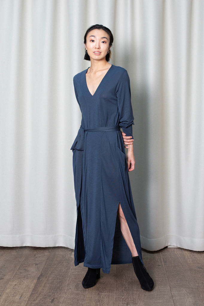 A full-length silhouette with high side splits, a soft V-neck, and feminine bell sleeves with long cuffs. The perfect blend of practical versatility and elegance.